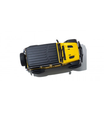 In the signature Jeep® Wrangler lineup, the Rubicon boasts the strongest off-road performance. With black over-fenders, front grille with dark grey accent, and the distinctive Jeep® round headlights, the formidable styling of the black hard top is immaculately reproduced in a model that rests on the palm of your hand.