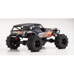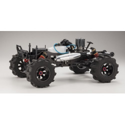 From its crawler-like agility to explosive power for wheelie starts, the FO-XX GP takes monster trucking to a new level. Formula off-road form combines with paddle tread pattern tires to produce breathtaking running performance. The hybrid tube frame and monocoque chassis structure is adorned with a pre-colored body and dummy front fog lights to create an intrepid style. A hinged front opening allows for fast and easy maintenance while the inner cover inside the fender not only fills the gap between the tires and chassis for improved scale appearance, but also keeps dirt out from the chassis. Proud owners of the FO-XX GP will be impressed with the fine attention to detail throughout, not to mentioned the proven front-rear 3-speed transmission + rigid axle + chain & shaft driven 4WD from the Kyosho Mad Force. Equipped with new polished welded manifold, tuned muffler and KE25 engine as its power source, the FO-XX GP becomes an unstoppable force. Use the break-in reducer and there is no need for break-in adjustment so even beginners can enjoy the brute force of the FO-XX GP as its runs wheelie charges with its powerful acceleration. This is a fully pre-assembled Readyset so all that's required is the fuel, engine starting tools, and batteries for the R/C system. With the 2.4GHz Syncro KT-231P transmitter included, simply switch the power on and it automatically scans for an open frequency to use. Other features include separate dual-rate settings and a failsafe function that applies full brakes if the signal is lost. Combining real machine form and unstoppable running power, the FO-XX takes off-road to the extreme.