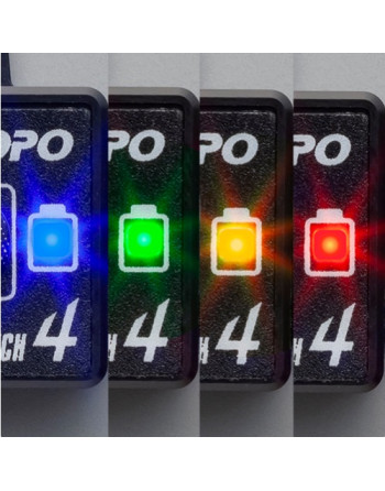 The type of battery connected to the Electrical Switch 4 and whether the voltage monitoring function is active are displayed using LED colors and lighting patterns. The Electrical Switch 4 is equipped with a monitoring function that cuts the switch when the battery voltage falls below the specified threshold to prevent over-discharge. Since the cut-off voltage differs depending on the battery type, users can switch to the appropriate battery mode for their application. Additionally, it is possible to specify whether the cut-off function is enabled or disabled.