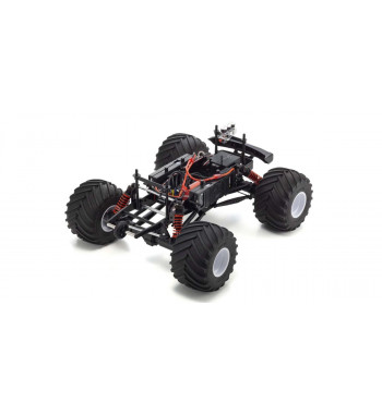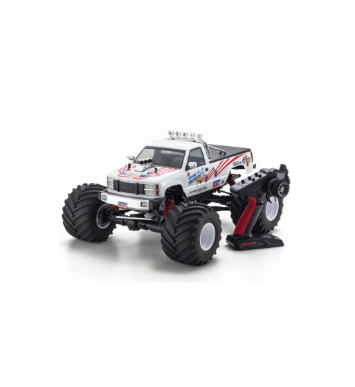 Born in the USA, the monster truck symbolizes America: big, bold and powerful! With pickup truck bodies emblazoned with dynamic motifs mounted on super tough chassis structures and big engines to power huge tires, monster truck racing filled and thrilled stadiums around America and the world with their awesome power and speed. Recreated in 1/8 scale as an R/C truck, the “USA-1” flies the American flag loud and proud as the recognized symbol of monster trucking. Dating back to the 1990’s, Kyosho’s earlier versions have been fully renewed with a newly created ULTRA SCALE body, uniquely reinforced 5-link suspension and stronger solid axles originally used on the Mad Crusher and FO-XX 2.0. Equipped with a high-power brushless motor with a 4-pole rotor and 12-slot stator generating 2300KV, the VE (electric power version) delivers outrageous speed and power characteristics that would rival that of the real USA-1. The high-powered unit produces dynamic performance that makes the large 570mm body length of the USA-1 feel smaller with acceleration pickup from a standing start surpassing that of the GP (engine powered) version. As a pre-assembled Readyset, the body is immaculately finished with paint and livery to capture the rich sense of scale of this iconic 1990’s machine. A charged motor battery and batteries for the transmitter are all that is required to start the action. With spare parts and a wide range of optional parts available to continually maintain and enhance performance, your USA-1 will provide thrilling fun over a long time.