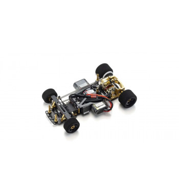 The 60th anniversary gold version of the Ext chassis combines 3-point suspension with the ladder chain 4WD system that revolutionized the R/C racing world in 1985.