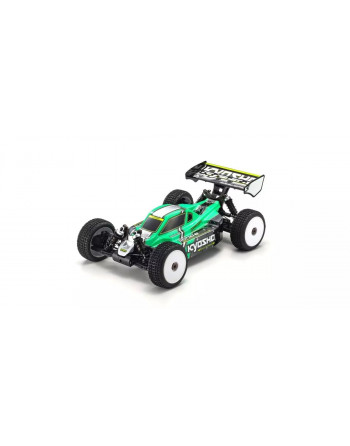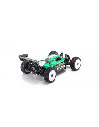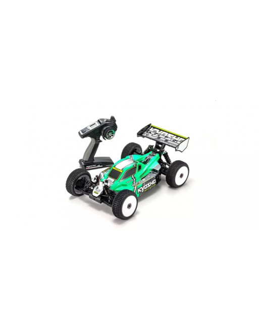 The worldwide status of the 1/8 scale buggy category has been built on a combination of high speed and dynamic fun. In recent years, EP (electric) buggies powered by batteries and electric motors have grown in popularity. Based on its celebrated 1/8 GP Inferno series buggy, Kyosho releases the electric powered Inferno MP10e Readyset! The new MP10e features significant updates but inherits the Inferno MP9e Evo. V2’s optimal weight balance from its left-right battery distribution that became adopted widely in 1/8 EP buggy designs. This layout also allows easier maintenance. Output characteristics of the KV2300 motor can be programmed on BRAINZ 8 ESC (electronic speed controller). With the R/C system pre-installed, you can be driving after unpacking the model and charging the battery. Equipped with the newly developed high torque and waterproof KS5071-09MW steering servo, the MP10e can handle the heavy loads of hard off-road driving. The cornerstone of the MP10e’s high performance and reliability is the suspension system, which is similar to the Inferno MP10 GP model. Not only can you outrun GP models with the Inferno MP10e; this high-powered electric machine is packaged as a Readyset with the racing potency to succeed at the highest level.