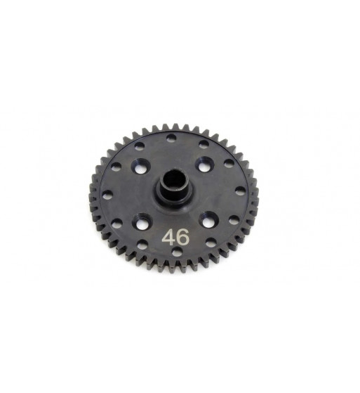 New light weight 46T spur gear for use with smaller diff for the center(Same as front and rear diff). By using the smaller diff, accelaration will be quicker and smoother. Smoother deaccelaration can also be achieved. This spur gear is design to fit the smaller diff case replacing the stock diff housing which is larger. Requires the use of IF403B Diff case set. Compatible with MP10/9 series.